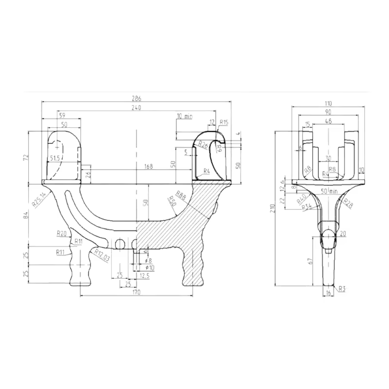 The Pre-embedded Iron Base is usually made of high-quality cast iron or steel, which provides the necessary strength and durability to withstand the forces exerted by trains and maintain the integrity of the railway system. The manufacturing process involves precision casting or forging techniques to ensure the accuracy and reliability of the product.
